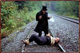 I have been watching Dudley Do-right for years and seriously Snidley is an awesome villian, cool lines, good style, and argues if he's wearing black. (he loves black too) He knows he's the bad guy and loves it. "I love to lurk, it's so me." One of my favourite scenes is with the Choo Choo train (pictured above) is coming and than he's just such a funny bad guy. Plus, Dudley is sooo gullible.....hunting vampires indeed. :P He has a funny voice too and a evil laugh. His dream ahs always been to be "The bad guy"!